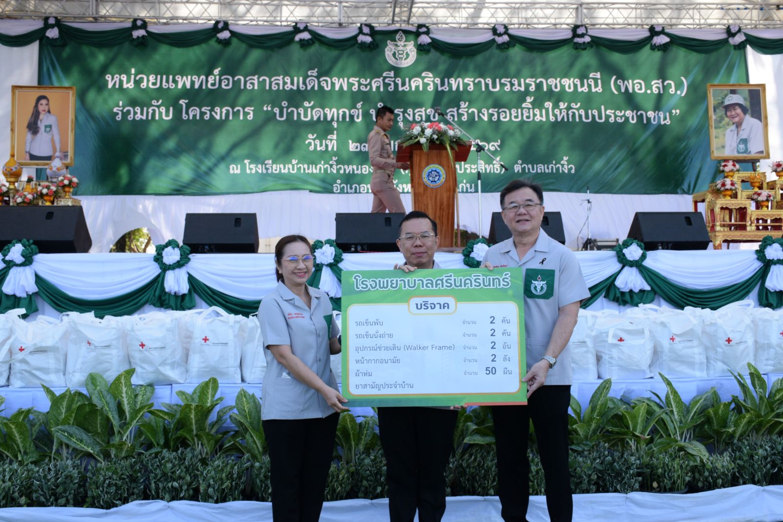 ทั้งนี้โรงพยาบาลศรีนครินทร์ได้บริจาคอุปกรณ์ทางการแพทย์ ดังนี้ รถเข็นพับ 2 คัน , รถเข็นนั่งถ่าย 2 คัน , อุปกรณ์ช่วยเดิน (Walker Frame) 2 อัน , ผ้าห่ม 50 ผืน , หน้ากากอนามัย 2 ลัง และยาสามัญประจำบ้าน โดยมีประชาชนในพื้นที่ และพื้นที่ใกล้เคียงเข้ารับบริการตรวจรักษาโรค และสนใจบูทกิจกรรมให้ความรู้เรื่องโรคต่าง ๆ เป็นจำนวนมาก